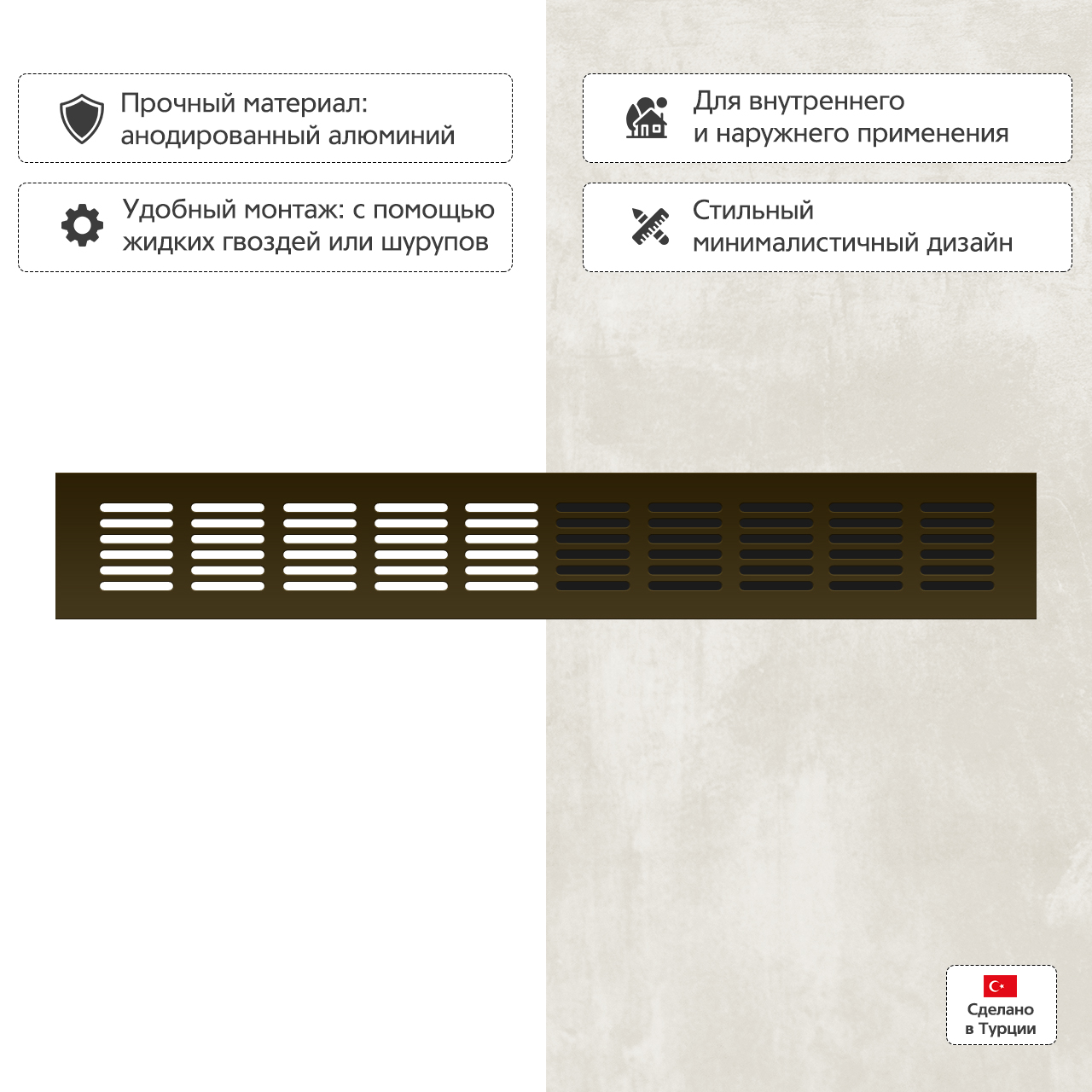 Прямоугольная вентиляционная решетка изготовлена из анодированного алюминия.