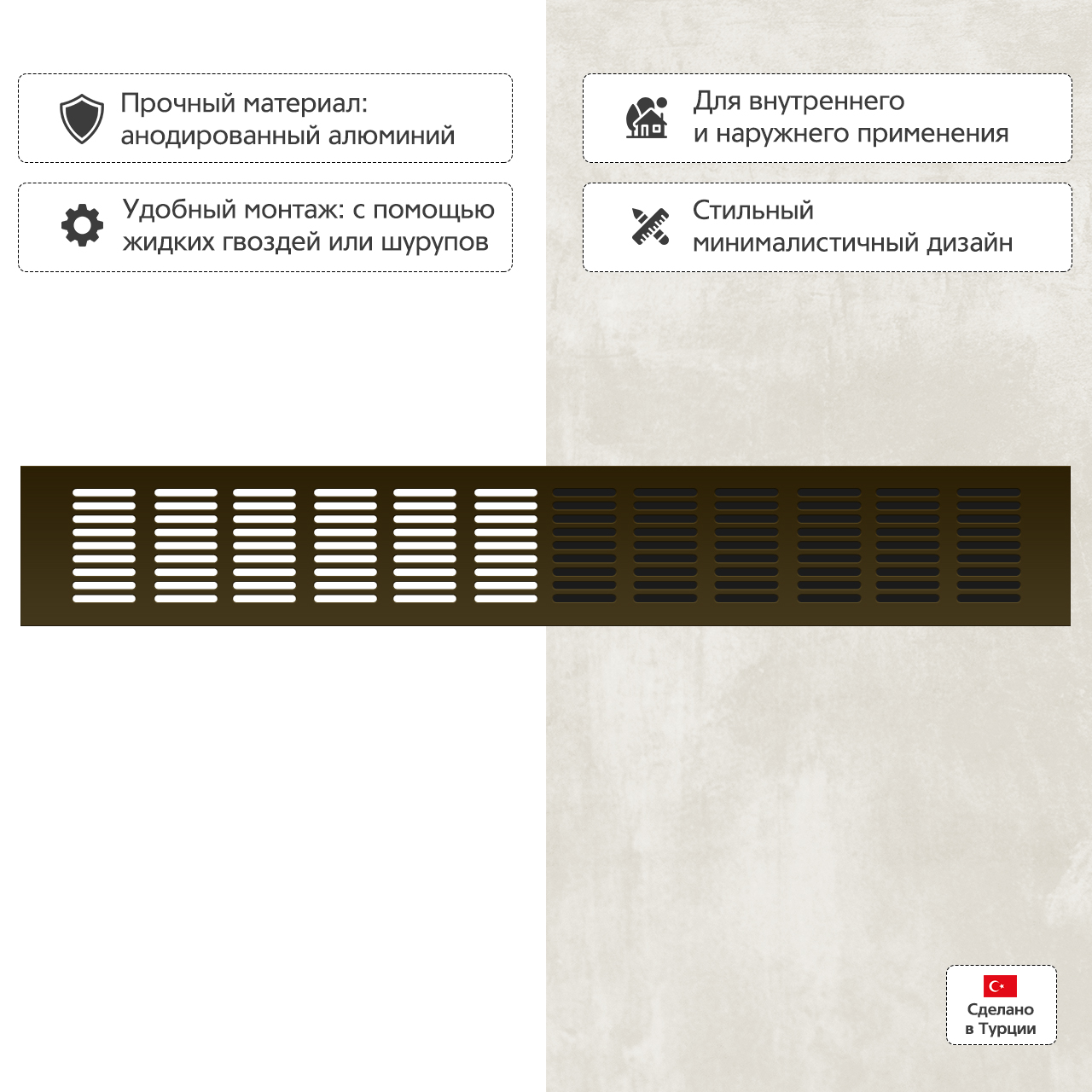 Прямоугольная вентиляционная решетка изготовлена из анодированного алюминия.