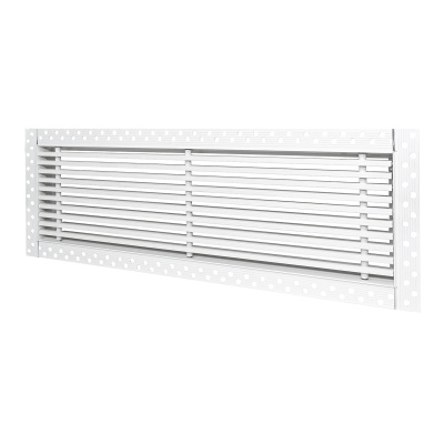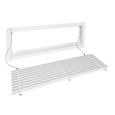 Данная решетка подходит для монтажа на любую поверхность под финишную отделку. Рамка и экран изготовлены из алюминия, опора экрана - из оцинкованной стали. Рама оснащена «полкой» 1,9 мм и рифлеными краями для большей адгезии финишного материала – шпатлевки, цемента. Решетка имеет съемную центральную часть с фиксированным углом наклона ламелей 15°. Она крепится к корпусу прочными металлическими тросиками, легко снимается для очистки и удобного обслуживания.