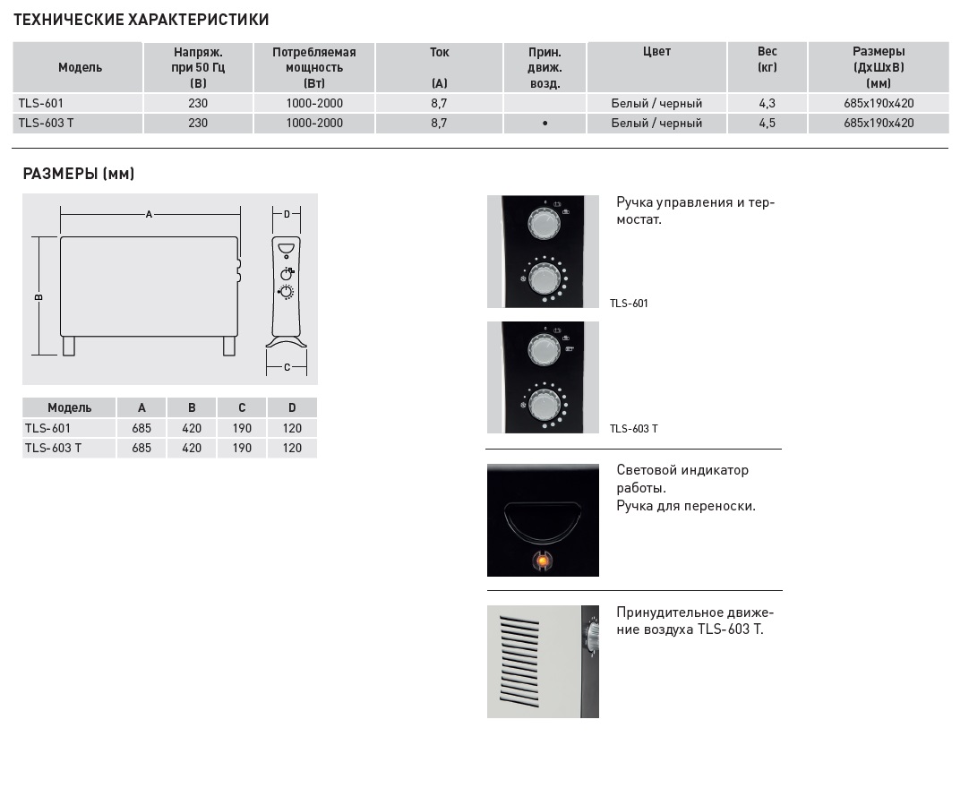 Для увеличения потока воздуха через конвектор, модель TLS-603 Т укомплектована встроенным вентилятором на передней панели.